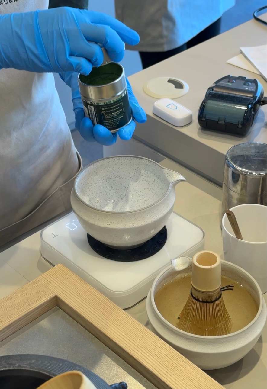Zone 1: Scale, chawan, sifter, and dry Heapwell matcha.