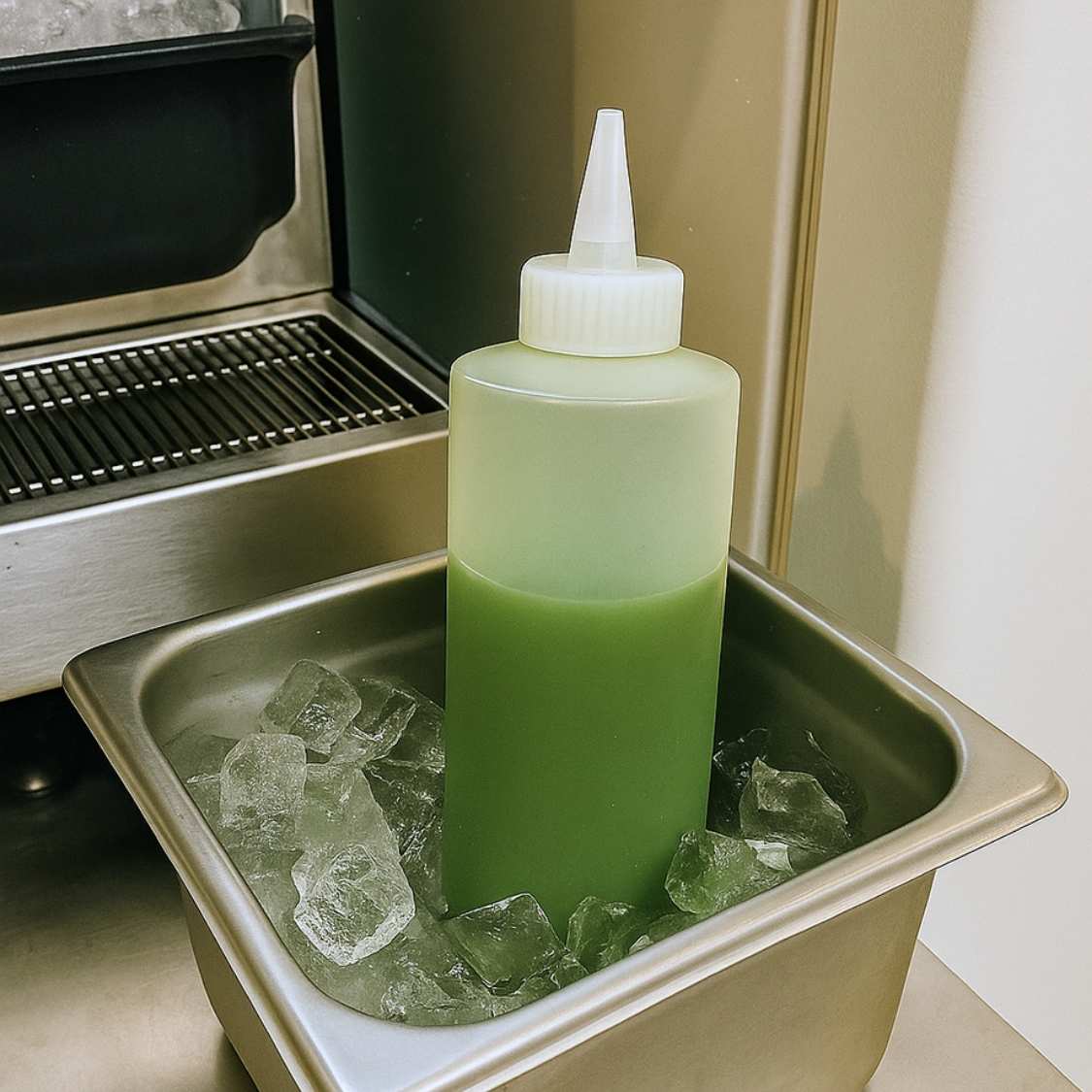 - Layout: The pre-batched matcha concentrate (see Module 4) is held in a 1L squeeze bottle. This bottle is kept in an ice bath directly next to the espresso machine's ice bin and the main milk fridge.